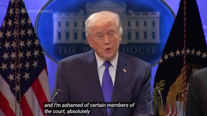 在自己的大规模关税政策被美国最高法院裁定违宪后,特朗普在记者会上公开称判决“可耻” AP视频截图